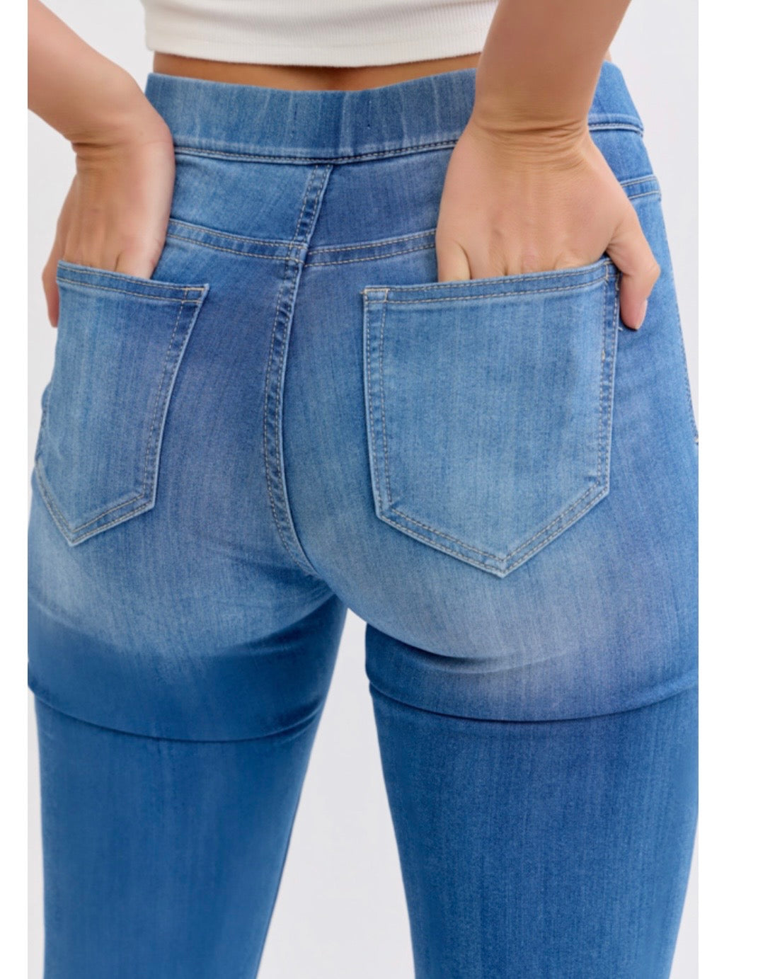 Cello Mid Rise Pull On Flares, Med Worn Wash — Worn spots and wash vary on each pair; 57% Cotton, 26%Polyester, 15% Rayon